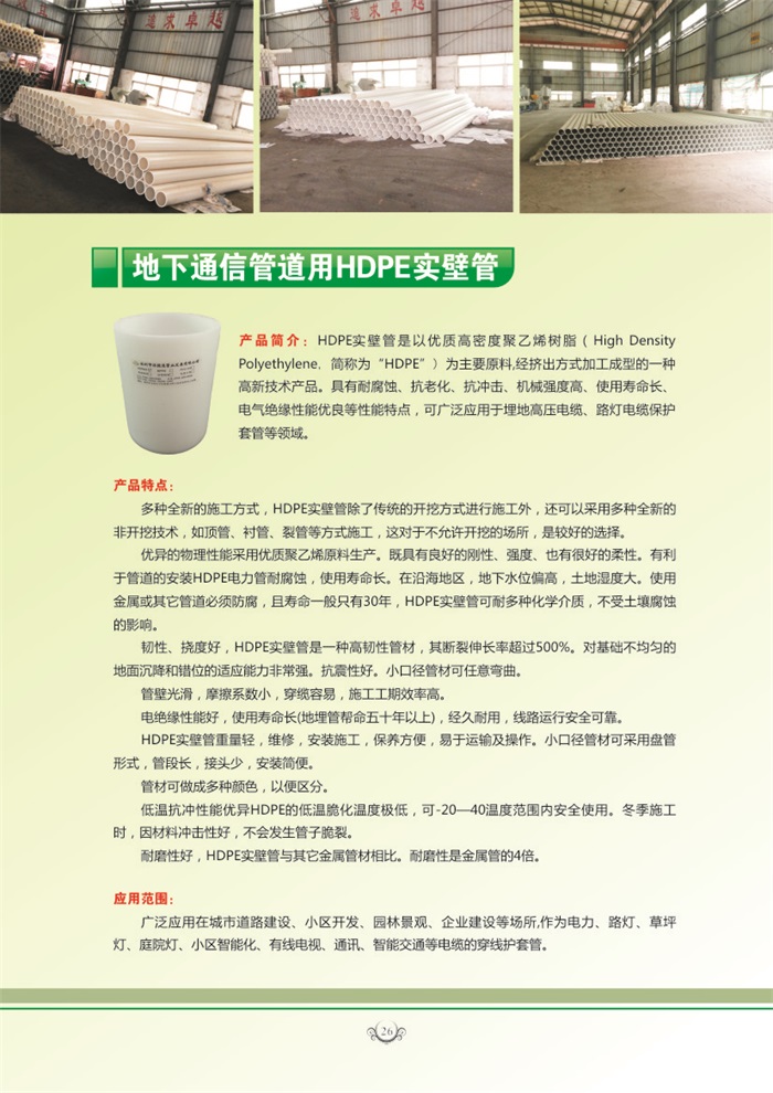 HDPE實壁管是以優質高密度聚乙烯樹脂( High Density Polyethylene,簡稱為"HDPE")為主要原料,經擠出方式加工成型的一種高新技術產品。具有耐腐蝕、抗老化、抗沖擊、機械強度高、使用壽命長、電氣絕緣性能優良等性能特點,可廣泛應用于埋地高壓電纜、路燈電纜保護套管等領域