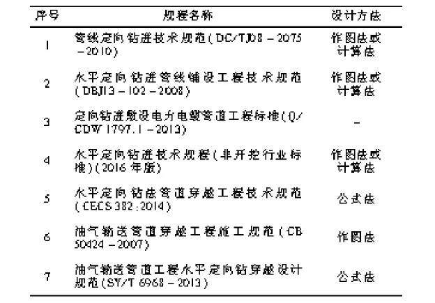 對于定向鉆進管線的軌跡設計方法,主要采用的是作圖法或計算法,對可供電力電纜定向鉆進軌跡設計的7個規程規范的設計方法進行歸類比較,詳見表1。